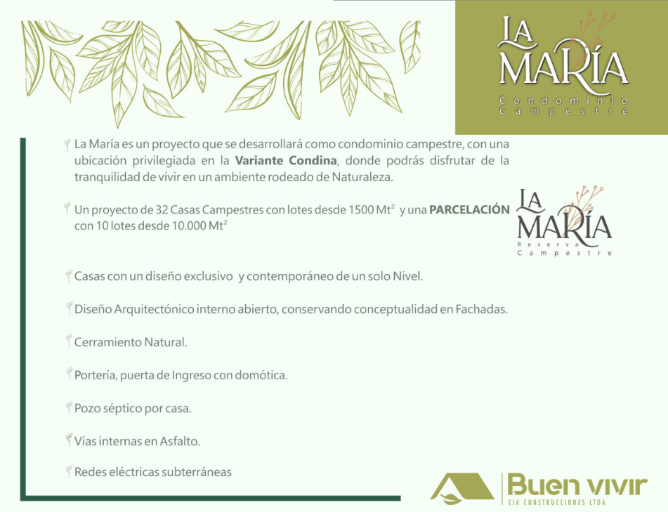 La María es un exclusivo proyecto de 32 casas campestres diseñado para quienes buscan vivir en un entorno natural y tranquilo. Ubicado en la Variante Condina, ofrece casas de un solo nivel con diseño contemporáneo, espacios abiertos y lotes desde 1.500 m². El proyecto combina la arquitectura moderna con la comodidad de la domótica y una infraestructura de alta calidad.